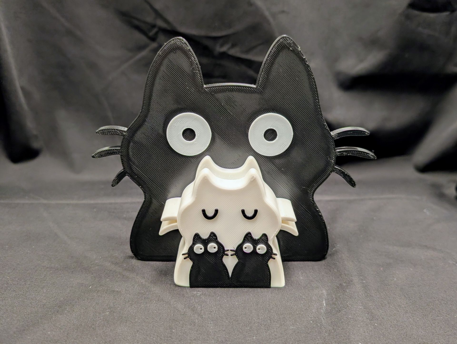 Behold the purrfectly poised trio. This charming cat-shaped glasses and pen holder will turn your desk or nightstand into a whimsical feline haven! In the back stands a regal black cat, ever-watchful, ready to cradle your glasses with an air of dignified responsibility. Then sits a humble white cat. Offering a paw to keep your glasses, pens, and pencils in check. Lastly, at their feet is a tiny black kitten. It's nestled in and curiously peeking out.